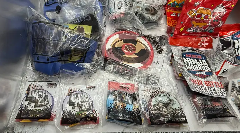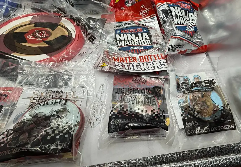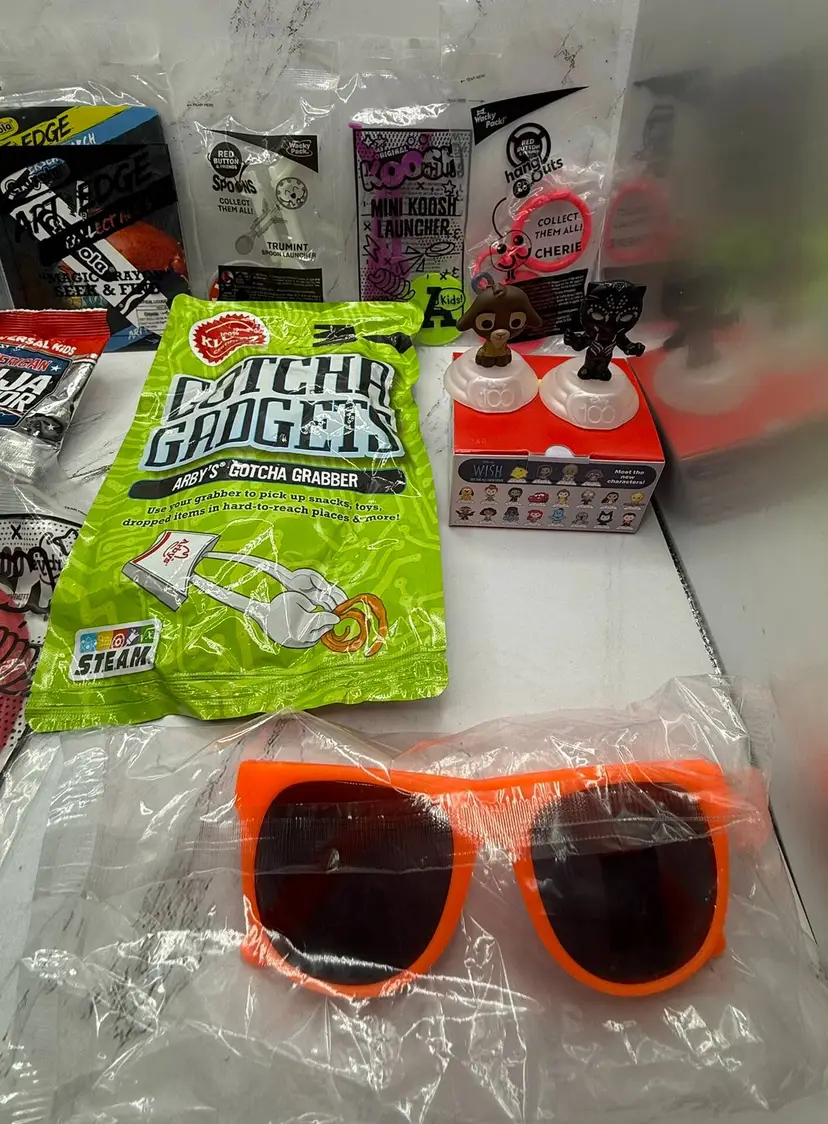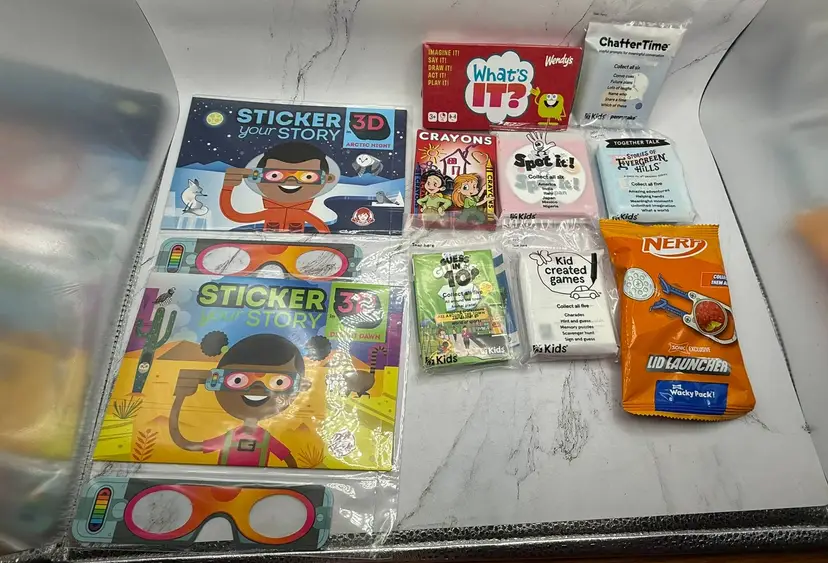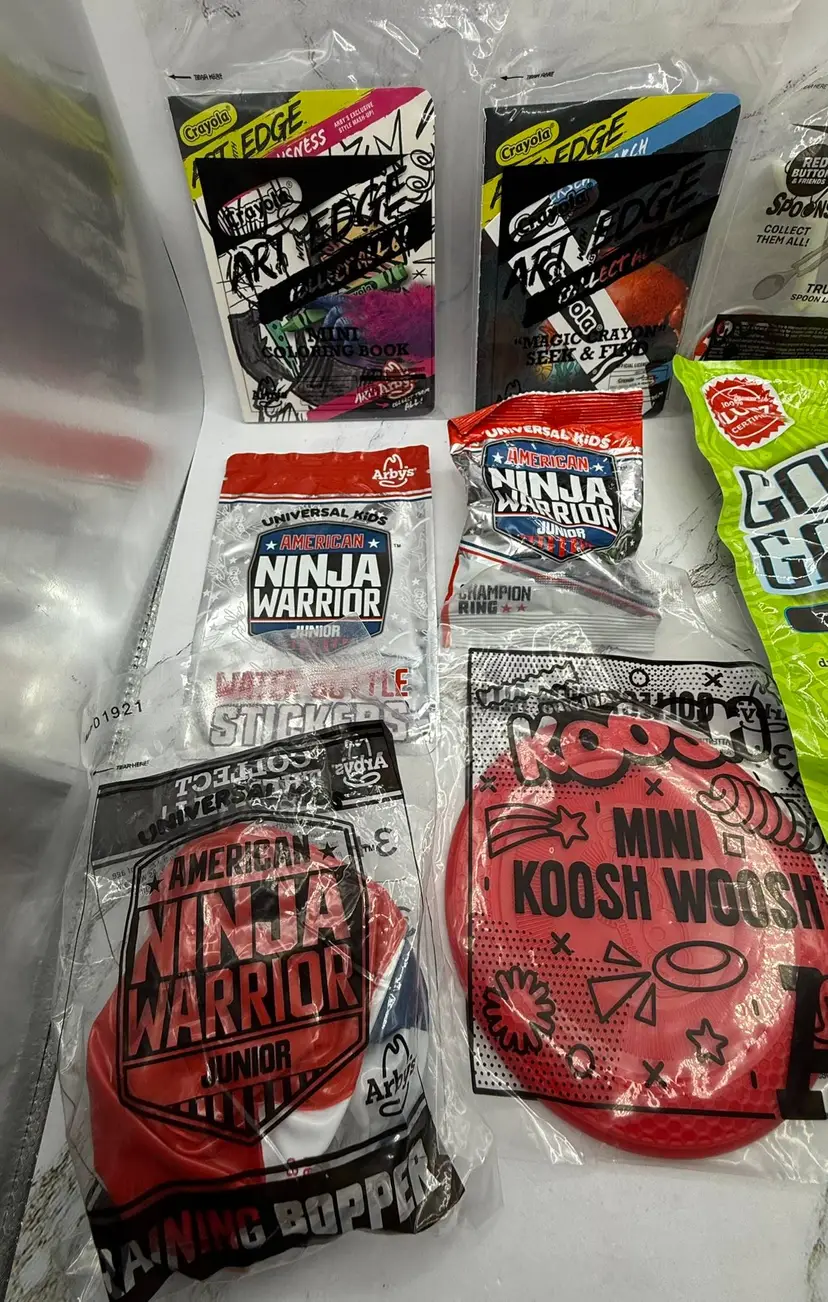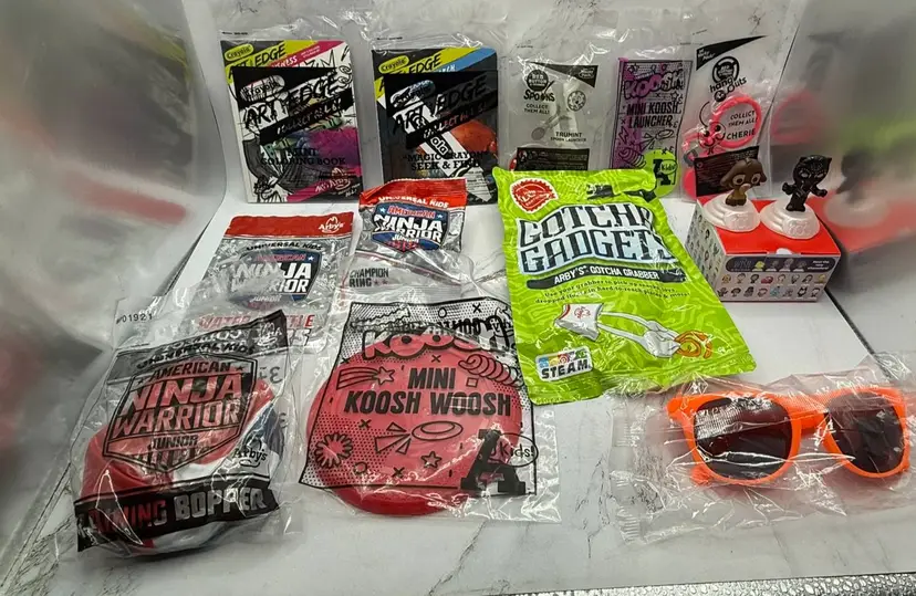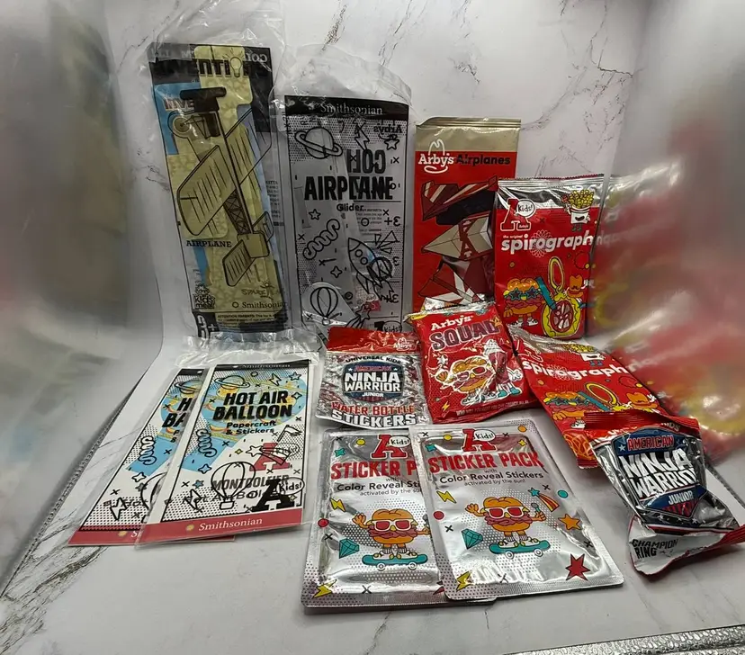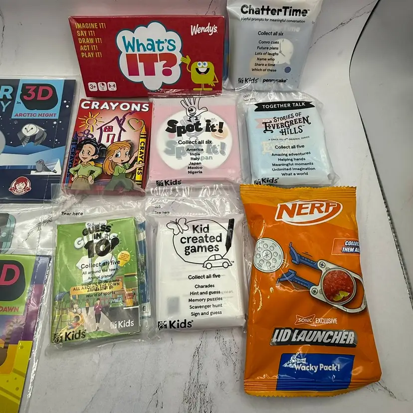 All sealed brand new packages of 56 various fast food toys, games, books, etc. from Arby's, Wendy's Subway, McDonald's, Sonic & Chick-Fil-A. Most are from Arby's. Please see all photos for what is included in the lot. All items come from a smoke free home, if you have any questions, please feel free to contact me.